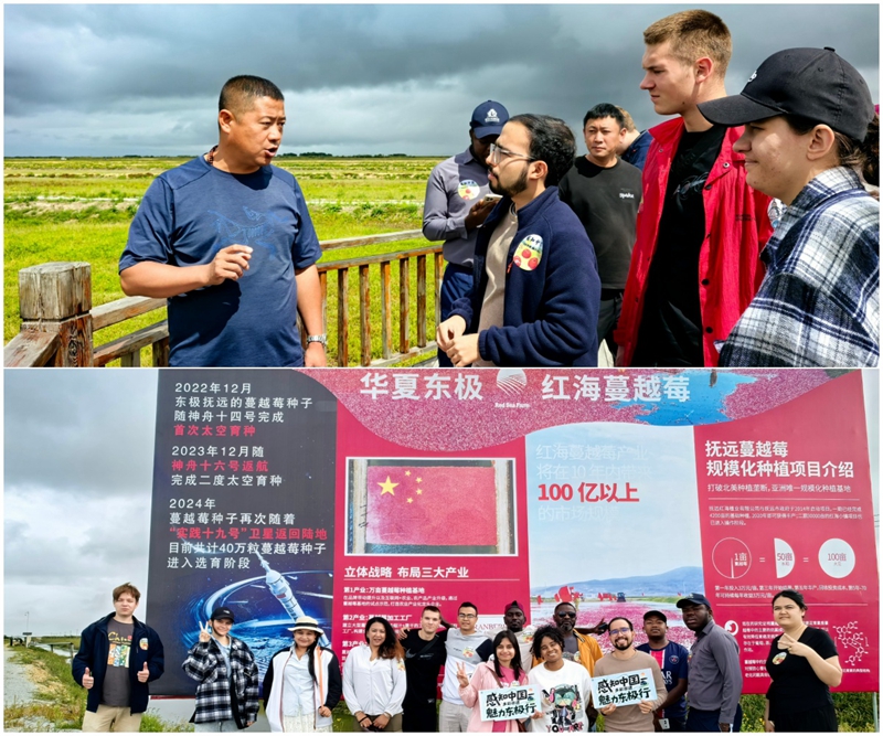 在抚远蔓越莓基地,湿地田垄间的翠绿植株铺展成毯,一串串饱满的红色果实缀满枝头,如凝结的红宝石般亮眼,虽未到采摘时节,却已尽显生机。技术人员特意驻足讲解:“为打破国外品种垄断、培育拥有自主知识产权的优质蔓越莓品种,基地早年前便将蔓越莓种子送上航天器,借助太空特殊环境诱发基因变异,如今选育出的品种不仅抗寒耐旱,果实品质也更优。”留学生们俯身细观果实形态,不时与技术人员交流;在谈及蔓越莓深加工产品研发与海外市场布局时,大家更是直观感受到,中国寒地农业正以科技为笔,在自主创新的道路上书写着产业升级的新篇章。