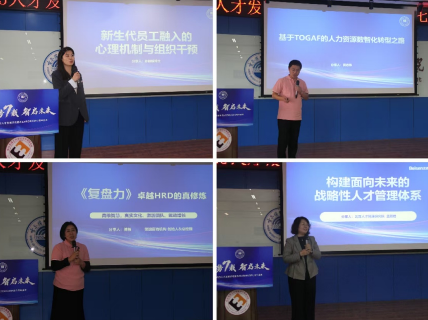 孙毅聪通过典型场景、成长背景、价值观与动机等视角,分析了新生代员工特点,介绍了多代际共存下有效的3I(Include、Individualize、Integrate)管理模型;通过多层次心理机制解析,提出了有效的组织社会化路径,以及激励、成长、灵活性、认可和关怀多方面的干预策略,为企业新生代员工实现更好的职业成长和组织适应提供了方向。田志伟为大家介绍了一汽数智化的转型方法、HR数智化转型实现路径、HR业务变革及数智产品等内容,报告高屋建瓴、信息量大;尤其是他从文科生通过努力转变成代码高手,让与会者无不钦佩。傅畅以小米雷军的演讲为引子,从第一性原理来思考HRD的价值锚点,通过“打造‘不表演’的文化、修选择人才的能力、修助力业务增长的击穿点”三重修炼,来打造HRD的复盘领导力。孟丽君为大家分享了组织-业务-人才价值驱动路径重构、组织和人才的流程重构、技术重构(HR数字化转型、数据驱动思维和决策、重构人才能力/画像)这一面向未来的战略性人才管理模型;着重为大家介绍了北森如何以人才标签为抓手,快速构建人才供应链的数字化系统。