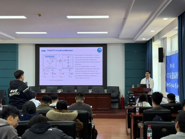 王子徽以“联邦学习中的合作公平方法研究”为题,阐述了联邦学习基础、协同公平性概念及相关现有方法,指出当前研究面临的两大核心挑战:客户端贡献度难以计算与奖励分配公平性难以保障。报告详细介绍了FedAVE、FedSAC两种方法的整体架构,以及有界协同公平性(BCF)相关内容与理论保证,对所提方法的性能进行了全面验证与分析。