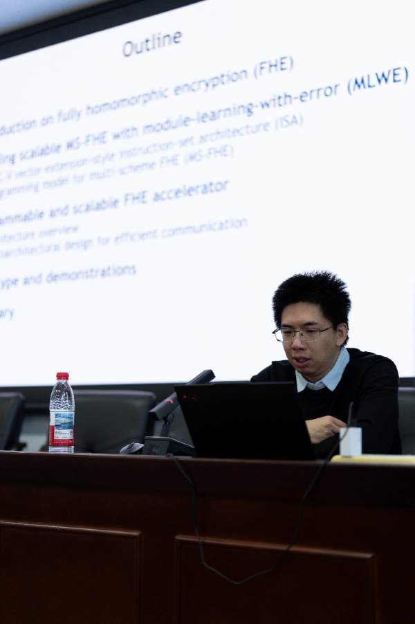 边松在报告《可编程高密度全同态加密计算电路与芯片技术研发》中重点展示了可编程全同态加密芯片的架构创新。针对全同态加密计算密度低、资源开销大的问题,其团队提出多种有效的解决方案,并在同态密码芯片的架构设计上进行创新,实现了高性能的同态密码硬件加速系统。该系统为全同态加密技术从理论走向工程化落地提供硬件支撑。