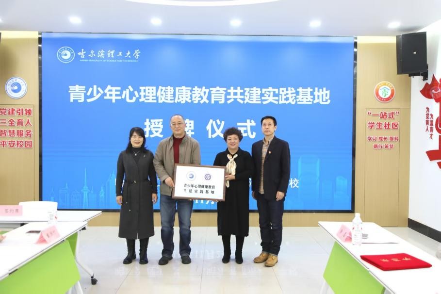 仪式最后,田海燕与吕彬江向徐孟、刘军授牌 “青少年心理健康教育共建实践基地”,标志着双方合作正式落地。在签约仪式结束后,哈尔滨市清滨小学校一行参观我校心理健康教育中心。