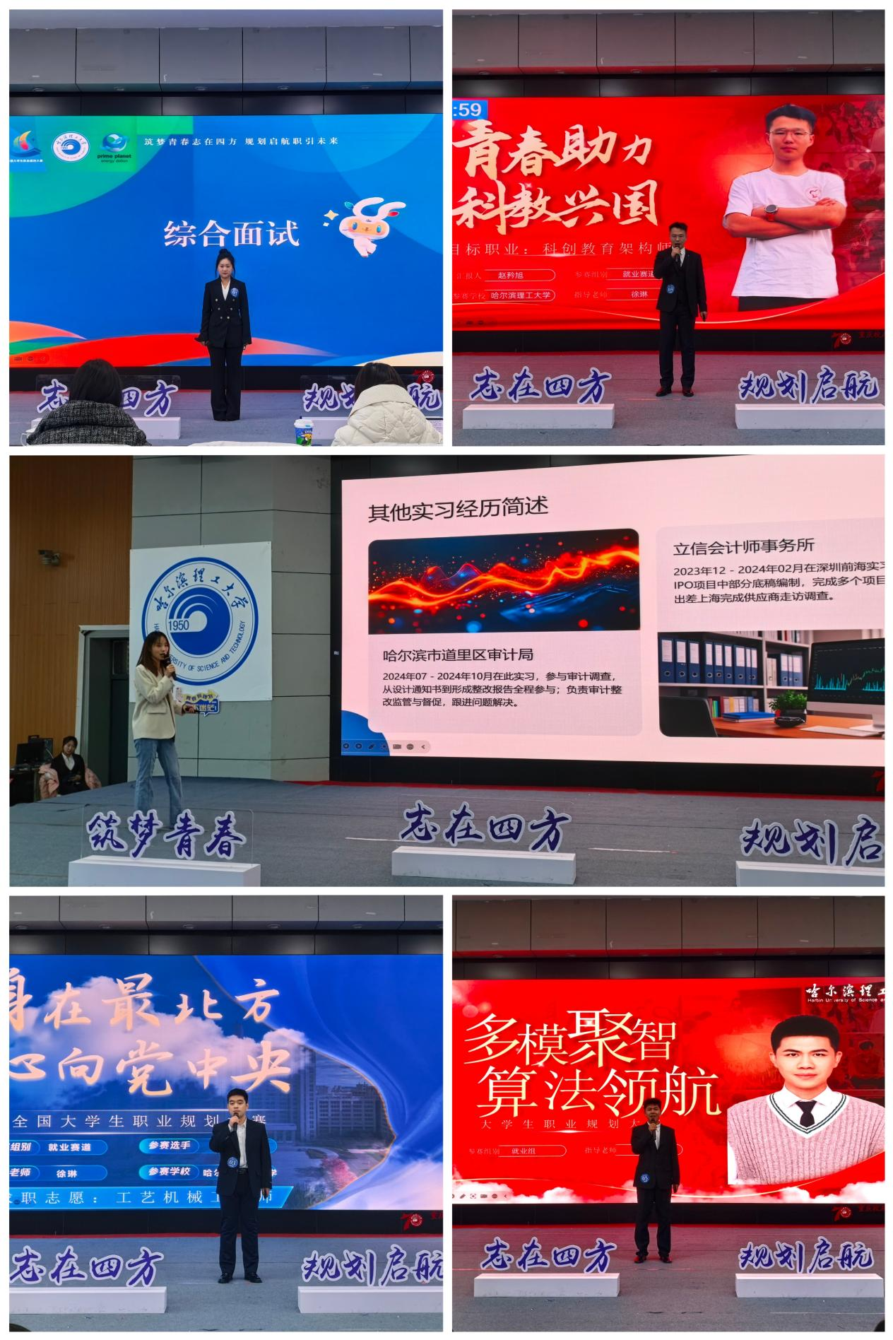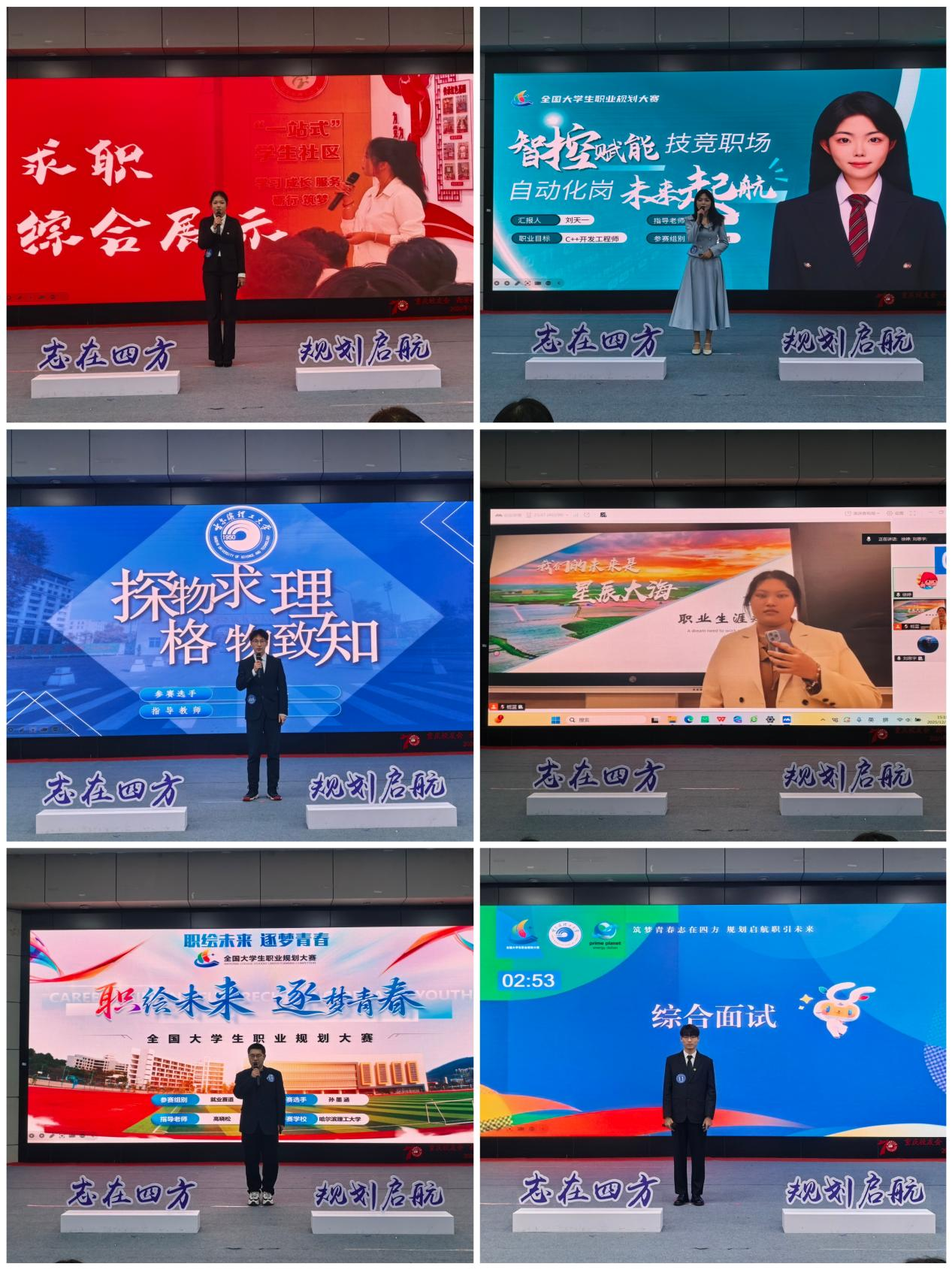自10月份启动以来,本次职业规划大赛得到了各学院的高度重视和广泛支持,广大师生积极参与,精心备赛,赛事氛围热烈浓厚。晋级决赛的选手中,包含成长赛道6人、就业赛道本科生组6人及就业赛道研究生组5人。决赛现场,选手们以饱满的热情、清晰的逻辑思路,通过PPT展示与现场答辩相结合的形式,从自我认知、职业探索、目标设定、路径规划、行动计划等方面,系统阐述了各自的职业发展蓝图,充分展现了哈理工学子对未来的清晰思考与奋进姿态。