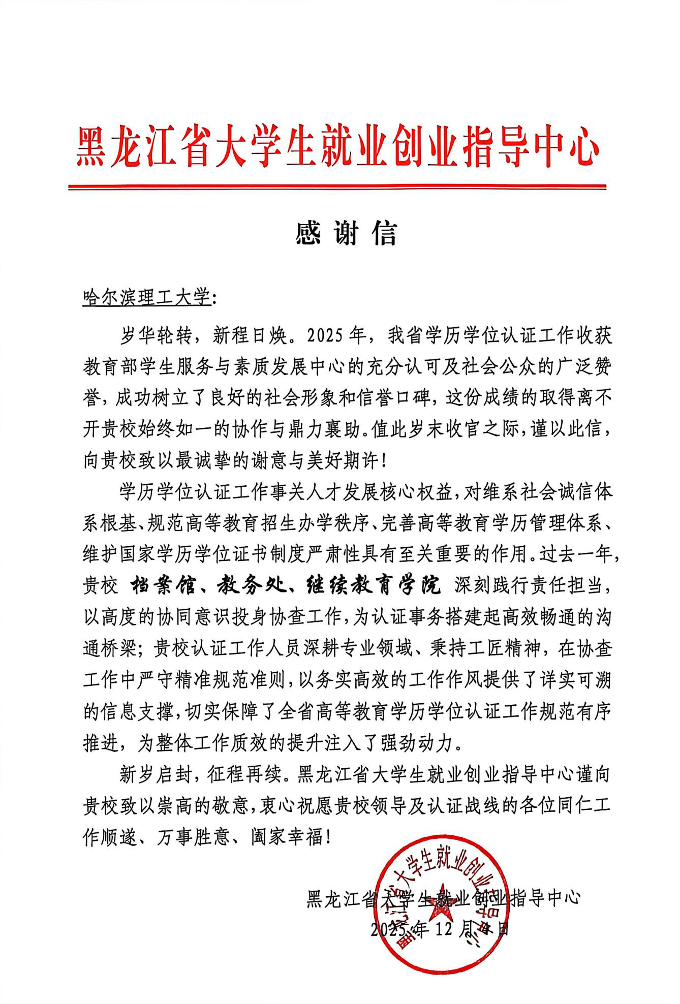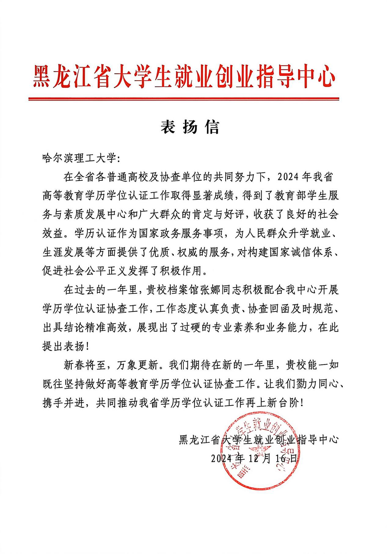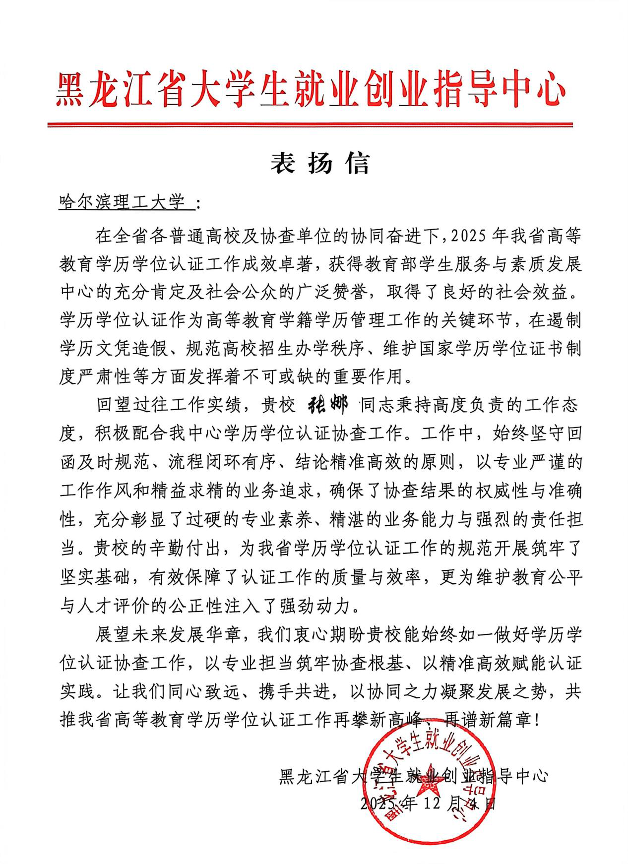 近日,哈尔滨理工大学档案馆接连收到黑龙江省大学生就业创业指导中心发来的《感谢信》与《表扬信》,凭借近年来在全省高等教育学历学位认证协查工作中的卓越表现,连续两年斩获省级认可,成为学校服务高等教育发展、践行责任担当的生动缩影。