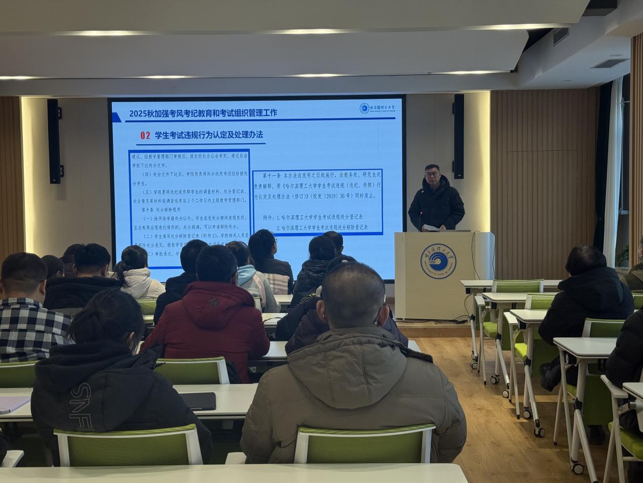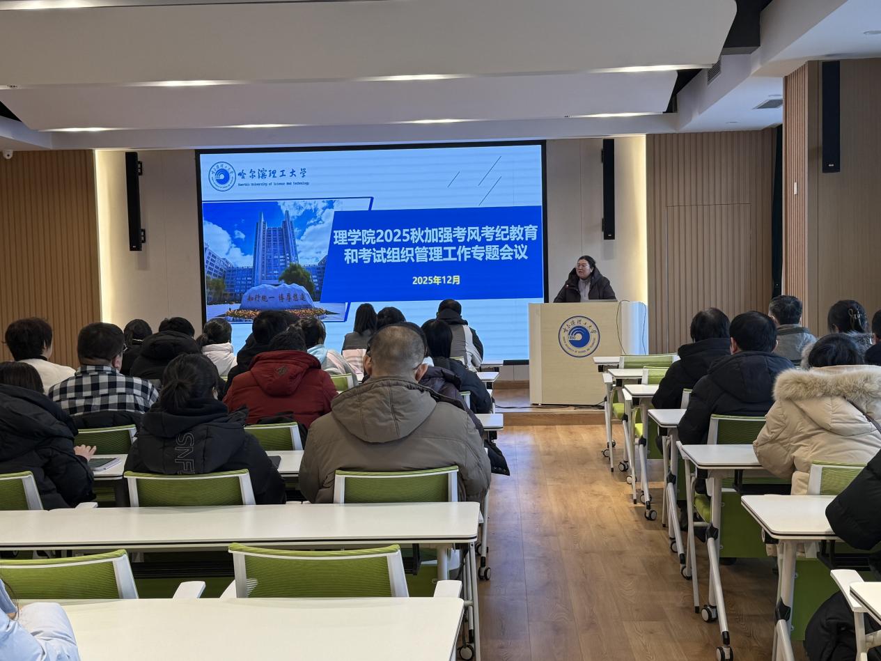 随后,孟桂芝传达了学校考风考纪和考试组织管理的工作要求,集体学习了《哈尔滨理工大学学生考试违规行为认定及处理办法(修订)》和《哈尔滨理工大学本科课程考试考核工作管理办法》等文件。进一步明确纪律要求,要求全体教师提高认识,履职尽责,严格执行监考工作规范,坚决防止考生将电子手表、智能手机等各类通讯设备违规带入考场,从源头上杜绝作弊隐患。同时,她对考试各关键环节提出了明确要求:在命题制卷上,强调命题要涵盖教学大纲要求的基本内容,知识点分布合理,同时严格落实试卷保密制度,从传送、印制到保管全程闭环管理;在成绩管理上,强调阅卷要坚持严肃、客观、公正原则,确保评分准确,按规定时限完成成绩报送与试卷归档,过程性考核成绩需规范记录存档,学生成绩异议复核需按程序办理。