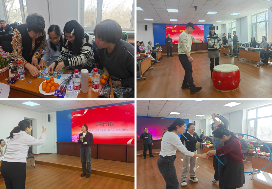 本次活动设置了趣味游戏和互动分享两个版块。趣味活动版块共设置巧手拼拼乐、蒙眼敲鼓、心有灵犀、快乐呼啦圈接力赛等四项游戏,全体女教工代表以抽签形式分为九个阵营,轻松开启趣味互动环节。集体项目中团队配合默契、协同作战,个人项目中踊跃参与、全力以赴,现场紧张而热烈,笑声、掌声此起彼伏,整个现场成了一片欢乐的海洋。