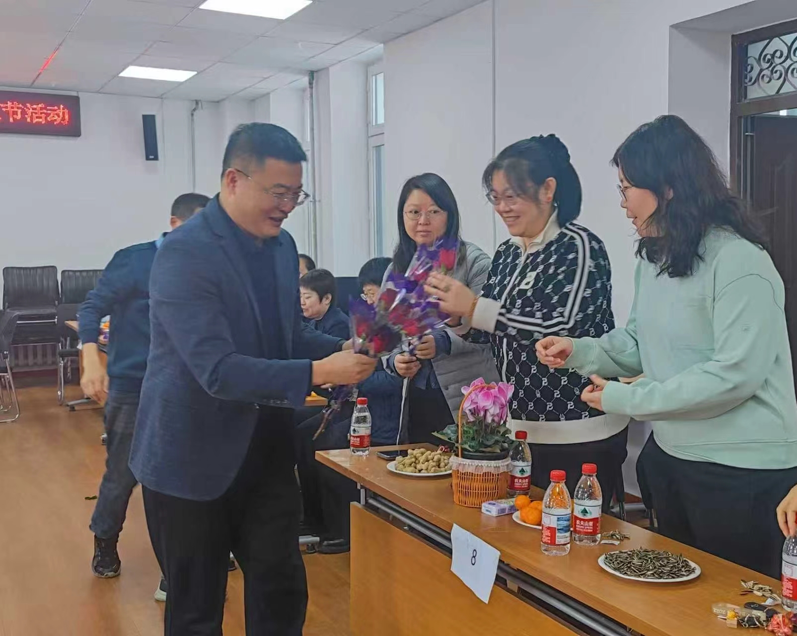 院长张凤鸣向女教师送上鲜花和祝福