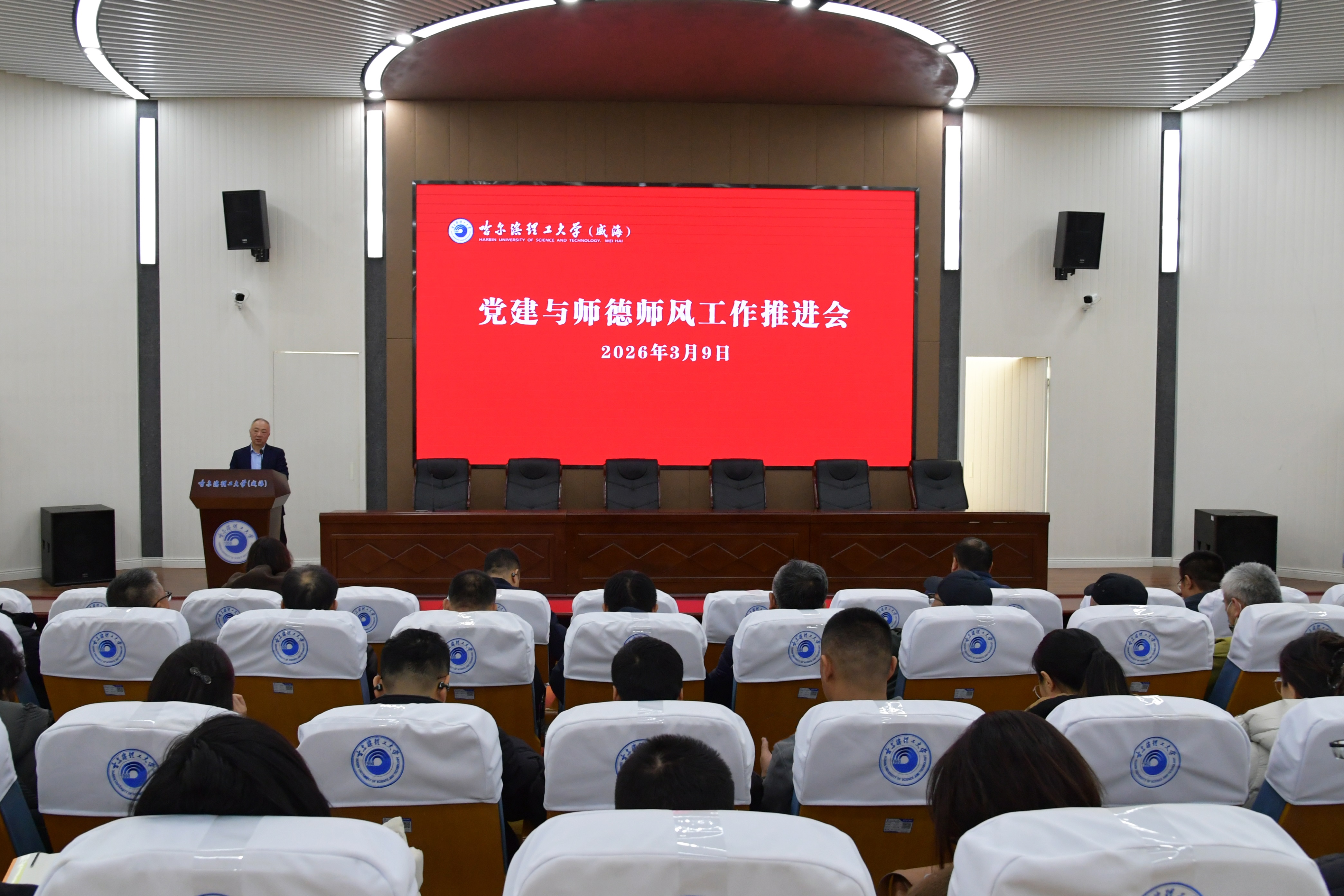 为深入学习贯彻习近平总书记关于高校党建工作、师德师风建设的重要指示批示精神,全面落实中央、省委及学校党委关于基层党建工作的各项决策部署,聚焦荣成学院基层党组织建设提质增效目标,抓实抓细师德师风建设各项工作,坚守“一融双高”工作理念,以高质量党建为引领,推动师德师风建设与学院中心工作深度融合、协同发展,荣成学院于3月9日15:30在大学生活动中心召开党建与师德师风建设工作推进会。学院领导、各部门负责人、党支部书记、工会小组负责人、党委工作办公室全体人员、工会全体人员参会,会议由学院党委书记段宏伟主持。