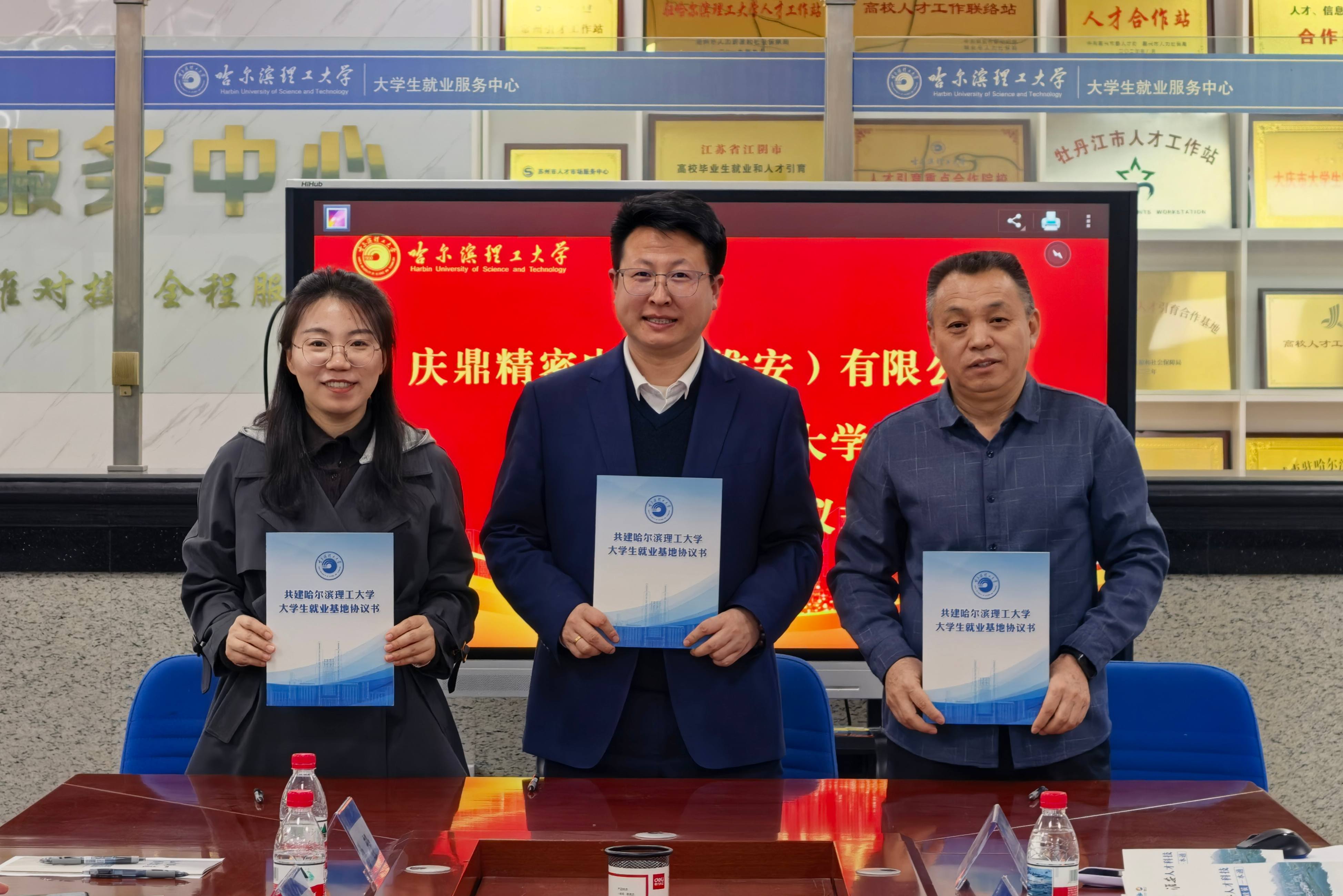 交流结束后,我校与淮安市签订《校地战略合作协议》,共同为“哈尔滨理工大学大学生就业创业基地”揭牌。电气学院、自动化学院与庆鼎精密电子(淮安)有限公司签订《校企战略合作协议》,开启校企共育应用型人才新篇章。