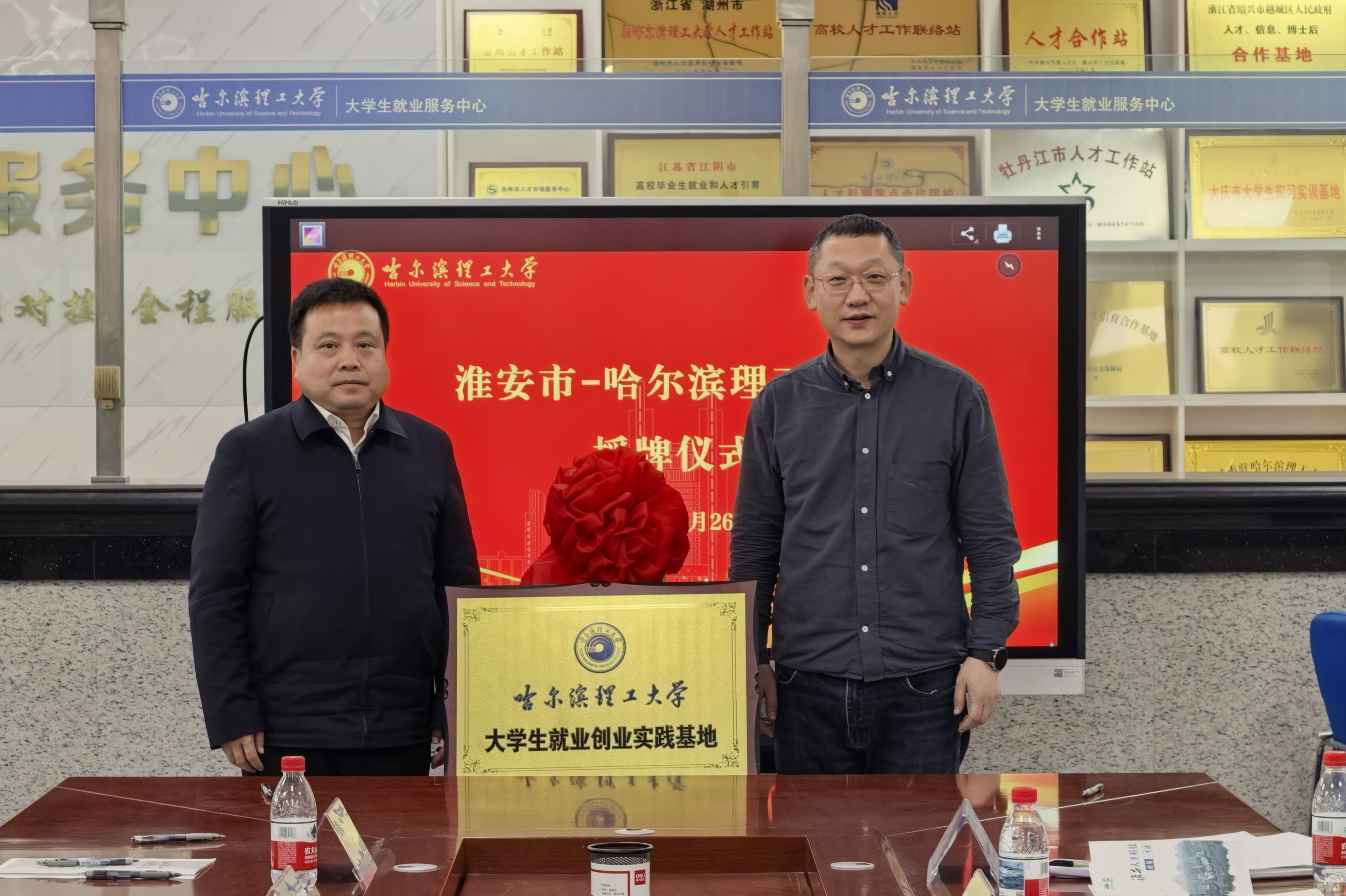 双方为“哈尔滨理工大学大学生就业创业基地”揭牌