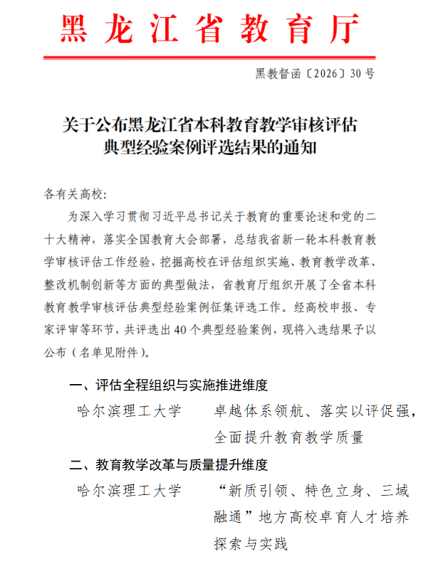 近日,省教育厅发布了《关于公布黑龙江省本科教育教学审核评估典型经验案例评选结果的通知》,公布了新一轮本科教育教学审核评估典型经验案例评选结果。经各高校申报、专家评审等环节,共评选出40个典型经验案例。我校组织申报的《卓越体系领航、落实以评促强,全面提升教育教学质量》案例入选评估全程组织与实施推进维度案例,《“新质引领、特色立身、三域融通”地方高校卓育人才培养探索与实践》案例入选教育教学改革与质量提升维度案例。2个案例成功入选,既集中展示了学校办学特色与育人成果,又体现了省教育厅对学校本科教育教学工作的充分肯定和审核评估工作的高度认可。