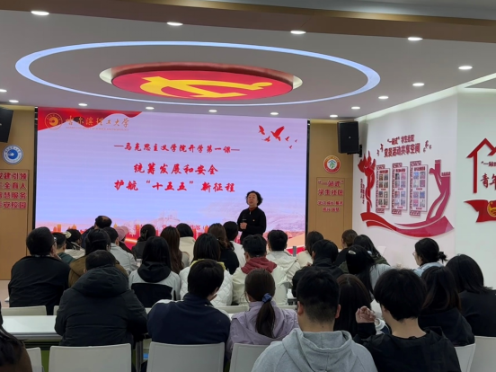 为深入学习贯彻总体国家安全观,引导研究生筑牢安全思想根基、明晰时代责任使命,4月13日晚,马克思主义学院在西区一站式学生综合服务大厅,圆满组织开展以“统筹发展和安全 护航‘十五五’新征程”为主题的研究生开学第一课。本次课程由学院院长叶丽主讲,学院党委副书记邬长明和学院2024级、2025级研究生全程参与。