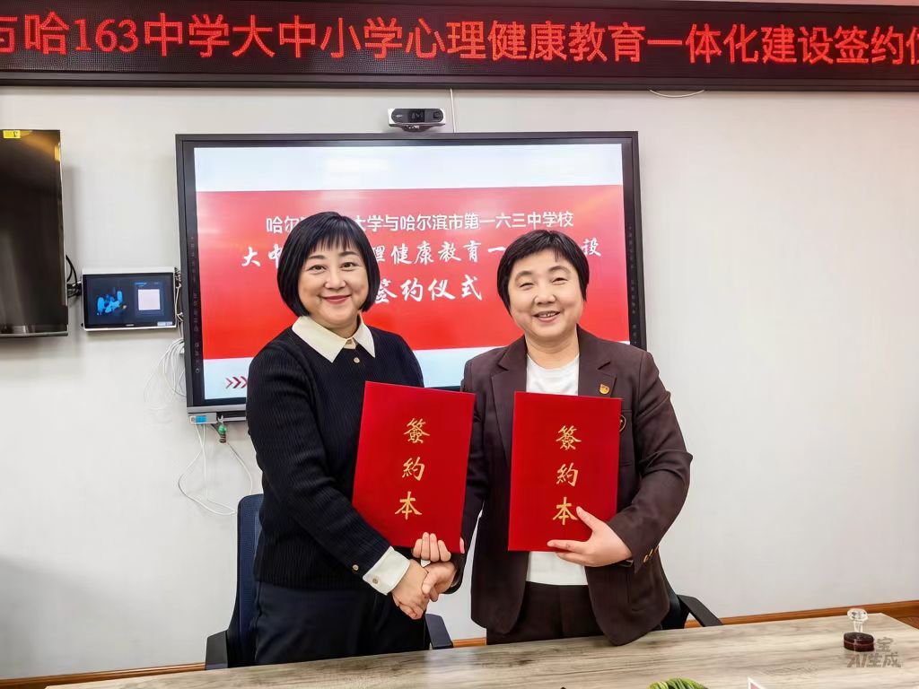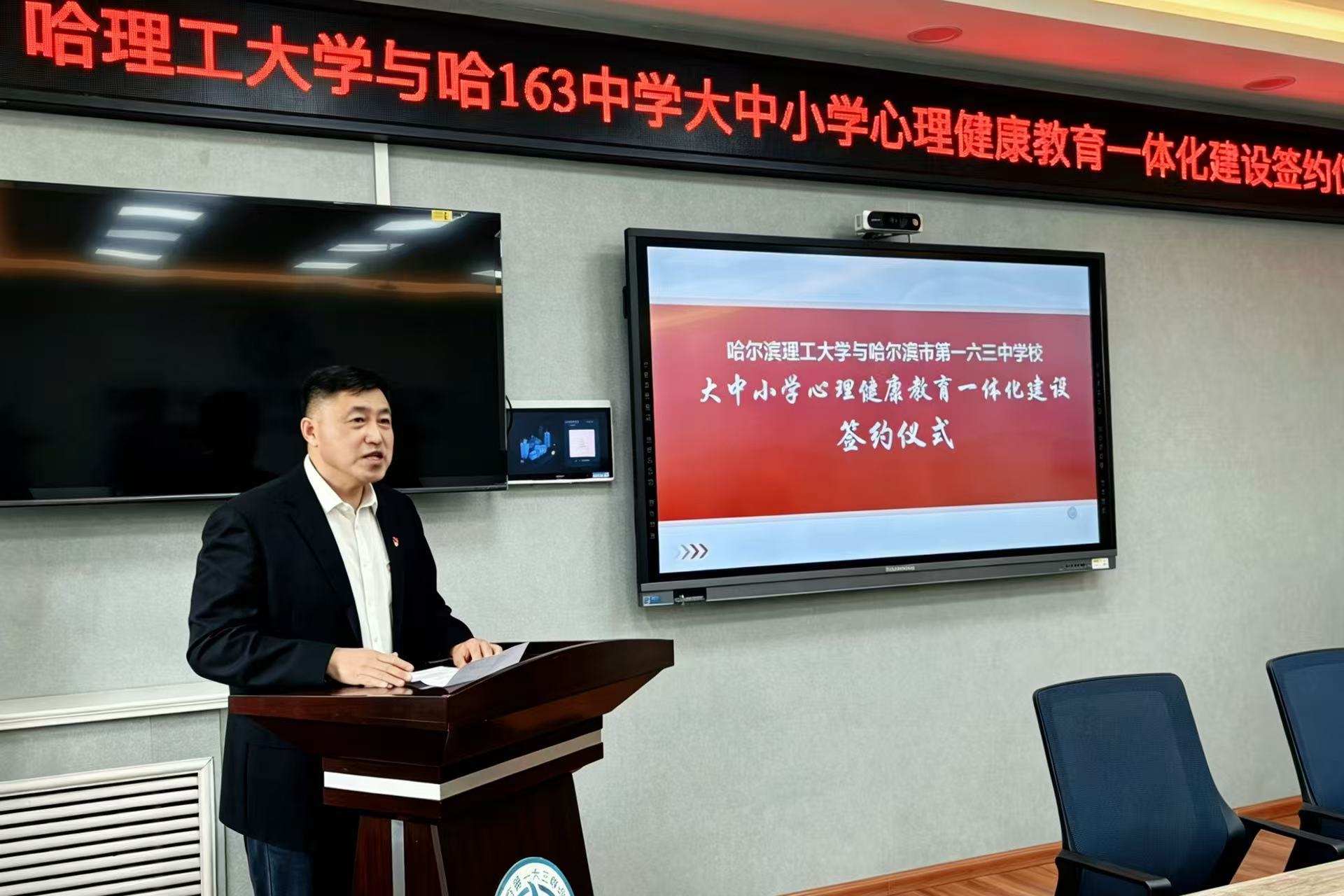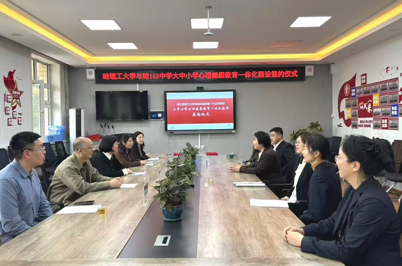 春风育桃李,携手护成长。4月16日14时,哈尔滨理工大学与哈尔滨市第一六三中学校大中小学心理健康教育一体化建设签约仪式在哈尔滨市第一六三中学举行。我校党委学生工作部部长、学生处处长戴湘竹,学生工作部副部长、学生处副处长田海燕,大学生心理健康教育中心主任吕彬江、副主任赵旋、项目负责教师徐博伦,哈尔滨市第一六三中学校党支部书记、校长孔凡晶,党支部副书记鲁晓东,德育副校长王旭辉,教学副校长赵丽丽,心理健康教师李燚及相关教师共同出席仪式。本次签约仪式由哈尔滨市第一六三中学校心理健康教师李燚主持。