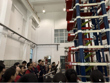 南之岗高中的师生们首先来到我校电气学院的高压大厅实验室,陈亭老师耐心细致地为同学们进行讲解,同学们通过近距离地观察超高压实验设备,了解、学习高压电力相关知识,直观感受电气学科的前沿魅力与科技力量。同学们兴趣盎然,与陈亭老师频频互动,深刻体会了科技创新对国家能源事业发展的重要支撑作用。